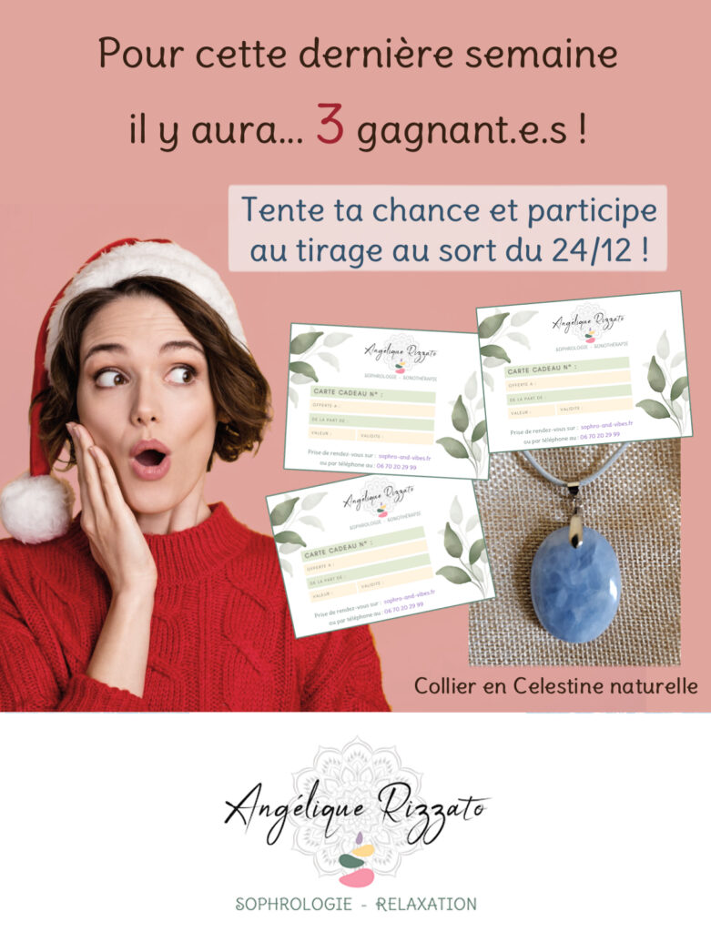 – 1 troisième carte cadeau pour une séance bien-être au choix en Sophrologie ou Relaxation sera attribuée par tirage au sort parmi tous les participants des 4 concours du mois de décembre !